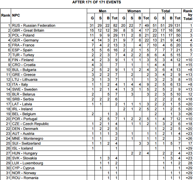 A dominare la competizione è stata la Russia, che ha ottenuto ben 131 medaglie di cui 51 d’oro, migliorando nettamente il risultato ottenuto due anni fa nell’edizione di Swansea, in Galles, quando gli atleti russi collezionarono 88 medaglie di cui 41 d’oro. Al secondo posto troviamo la Gran Bretagna, con 23 titoli, mentre la Polonia ne ha ottenuti 22. Da segnalare anche l’assenza di alcune nazionali di rilievo, come quelle di Ucraina ed Olanda, che hanno preferito non partecipare alla rassegna continentale per preparare meglio le Paralimpiadi di Rio 2016.