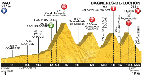 E’ tempo di Pirenei. Partenza dal più volte presente al Tour paese di Pau, 50 chilometri di pianura prima delle salite. Si comincia con il famosissimo Col du Tourmalet: si arriva sulla dura vetta del Souvenir Jacques Goddet, in una delle salite più affrontate alla Grande Boucle. 19 chilometri al 7.4%, con spesso punte superiori al 10%. Il primo Hors Categorie del Tour. Non solo Tourmalet. Discesa tecnica e poi si riinizia a salire: Hourquette d’Ancizan, seconda categoria, 8,2 chilometri al 5% di pendenza media. La prima parte di gara potrebbe riservare sorprese.