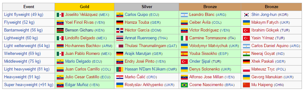 Di seguito sono riportati tutti i podi delle dieci categorie di peso, con i nomi dei pugili che hanno conquistato gli ultimi pass olimpici evidenziati in verde (cliccare sulla tabella per ingrandire):