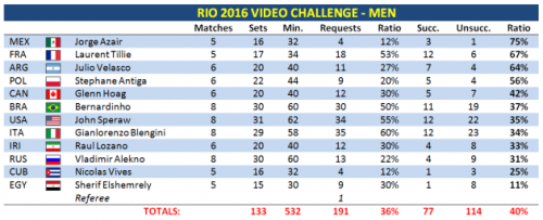 Al secondo posto lo statunitense John Speraw (34 chiamate, 35% di efficienza) che ha preceduto Bernardinho del Brasile (30, 37%). La miglior efficienza è del messicano Jorge Azair (75% ma ha utilizzato il video check solo quattro volte), bene il 67% del francese Laurent Tillie e il 64% dell’argentino Julio Velasco.