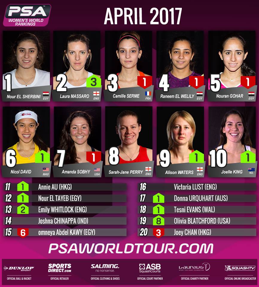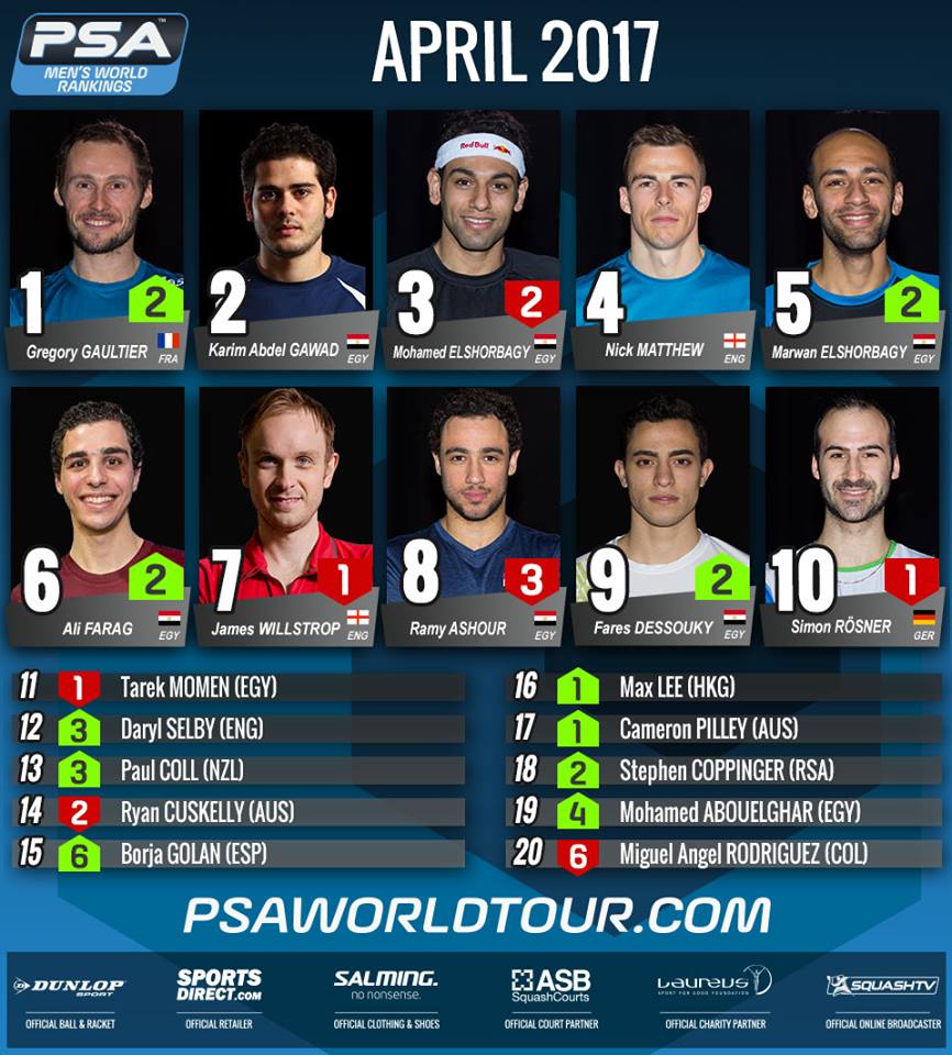 Il ranking PSA di aprile 2017 incorona nuovamente il francese Grégory Gaultier, che grazie alla vittoria del British Open ritrova la leadership davanti agli egiziani Karim Abdel Gawad e Mohamed El Shorbagy, che guidava la classifica nel mese di marzo. A trentaquattro anni suonati, il giocatore di Épinal stabilisce inoltre il nuovo record del più anziano numero uno del mondo tra uomini e donne, che precedentemente apparteneva all’australiana Sarah Fitz-Gerald. Per i colori azzurri, il numero uno resta il campione nazionale Yuri Farneti, reduce dall’Open di Amsterdam ed attualmente al 194mo posto del ranking PSA.