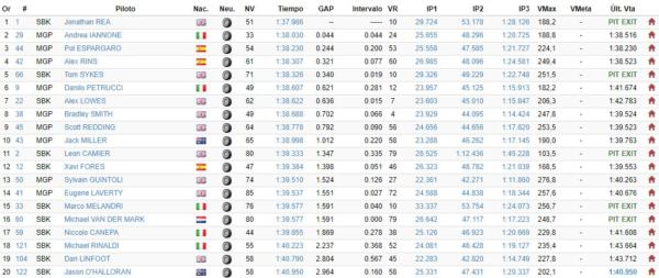 Tra i due piloti della Suzuki si è inserito Pol Espargaro, 2° in MotoGP e 3° assoluto a due decimi esatti da Iannone. Anche la KTM ha lavorato in ottica 2018, confermando i progressi già mostrati durante tutto l’arco della stagione da poco conclusa e promettendo di essere protagonista nel prossimo anno, anche con Bradley Smith, 8°. La prima delle Ducati è quella di Danilo Petrucci, autore del 6° tempo assoluto: l’italiano sta continuando il processo di adattamento alla GP18, che ha guidato per la prima volta solo in questa settimana, non avendola avuta a disposizione nei test di Valencia. Chiudono la top ten assoluta, poi, l’Aprilia di Scott Redding (9°) e la Ducati di Jack Miller (10°), sempre più a suo agio alla guida della GP17.