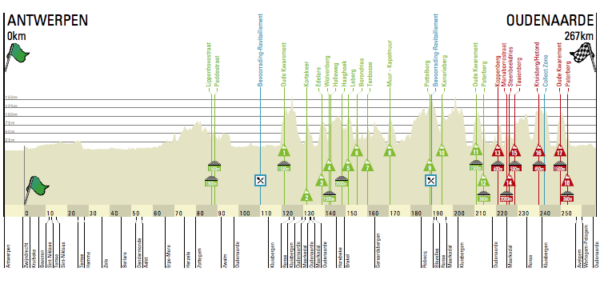 La prima fase di gara è piuttosto agevole e caratterizzata solo da un paio di tratti di pavé pianeggianti che però non dovrebbero creare particolari problemi al gruppo, salvo eventuali problemi meccanici o altre situazioni particolari. Dopo 115 chilometri la prima asperità, l’Oude Kwaremont. Oltre due chilometri massacranti (la pendenza media è del 4% solo perché in diversi tratti spiana) e con fondo molto disconnesso che ritroveremo più volte nel corso della giornata. La pendenza massima è dell’11%, ma la vera differenza la fa il pavé. Nei successivi 50 chilometri altri sette muri, che potrebbero anche creare una prima scrematura in gruppo, soprattutto perché i corridori li affronteranno in rapida successione e senza avere l’opportunità di recuperare le tante energie spese, fisiche e mentali. L’ultimo della serie sarà il Muro di Geraardsbergen, un vero e proprio passaggio leggendario della corsa: pendenza media del 9% su 750 metri di lunghezza, punte al 20. Dalla vetta mancheranno 96 chilometri all’arrivo. Dopo questa prima girandola di pavé e salite, la corsa si tranquillizzerà, con soli due muri (Pottelberg e Kanarieberg, tra i meno 70 e i meno 80) fino al chilometro 200.