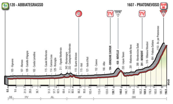 Tanta, tantissima pianura per tre quarti di questa frazione. Si parte dalla Lombardia ma ci si sposta subito verso il Piemonte: Milano, Pavia, Alessandria ed Asti le province toccate prima di andare verso Cuneo, dove si concluderà questa tappa. Poco rilevanti i primi 130 chilometri: subito dopo il traguardo volante di Grinzane Cavour si inizia a far sul serio. Primo GPM di giornata è quello di Novello, un vero e proprio antipasto, breve e non duro (quarta categoria). Ancora pianura prima di andare verso Prato Nevoso, salita già percorsa dal Giro nel 1996 e nel 2000 e arrivo al Tour de France nel 2008. 15 chilometri, pendenze sempre superiori al 7% con punte che vanno nettamente oltre il 10%, proprio sul finale dove si percorreranno alcuni tornanti durissimi.