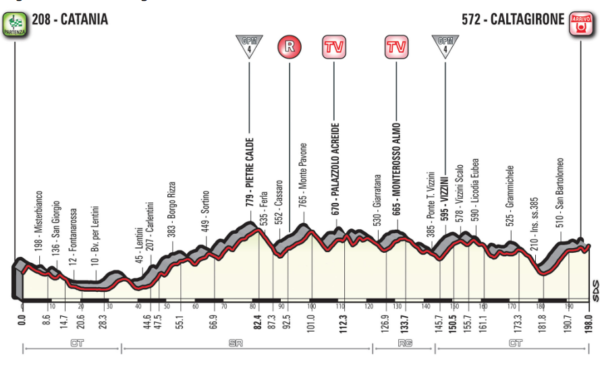 Nonostante qualche lieve asperità, la prima fase di tappa è la più agevole e non dovrebbe creare grandi problemi ai fuggitivi, che possono andare all’attacco su un terreno non troppo impegnativo. Superati i primi 44 chilometri, però, inizia un lungo tratto di saliscendi, che non concederà tregua fin sul traguardo. La prima salita di giornata ufficiale è il Gpm di Pietre Calde, al chilometro 82. 9 chilometri al 3%, nulla di impegnativo ma la frazione nell’insieme arriva a 2500 metri di dislivello, non certo pochi. I mangia e bevi continueranno anche nella fase centrale con i traguardi volanti di Palazzolo Acreide (km 112) e Monterosso Almo (km 133), mentre la salita di Vizzini è posta al chilometro 150, anch’essa su pendenze attorno al 5%. Da qui si contano almeno tre strappi nei 23 chilometri successivi, prima di un tratto in discesa verso il chilometro 181. Da qui, salita al 3-5% fino a San Bartolomeo, a 7 dal traguardo. Difficile qualcuno possa provarci, ma con un ritmo elevato il gruppo potrebbe allungarsi. Importantissimo l’ultimo chilometro, all’8,5% di media, anche se gli ultimi 700 di fatto sono tutti in doppia cifra, con una punta del 13% ai – 500 metri. Uno strappo che potrebbe mettere in difficoltà anche gli uomini di classifica.