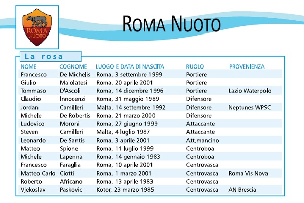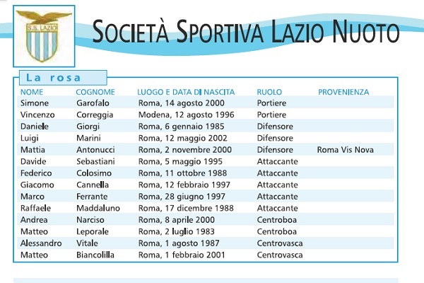 Rosa praticamente tutta romana per la società biancoceleste, che vuole migliorare il piazzamento della scorsa annata puntando sul blocco che ha raggiunto la salvezza nella scorsa stagione.