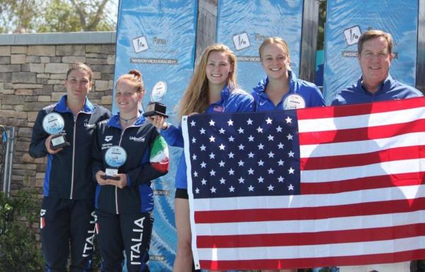 Parte con il botto italiano, anche se atteso in qualche modo, la seconda e ultima giornata di finali a Mission Viejo, California, Stati Uniti, per la terza tappa del FINA diving Grand Prix 2019. Elena Bertocchi, già argento ieri nel singolo da 3 metri (primo podio internazionale tra le senior in questa gara, olimpica, per la milanese) e Chiara Pellacani, 16 anni, romana, protagonista di un vero tour de force tra trampolino e piattaforma nel weekend (ma sempre al top), con una performance solida e convincente si piazzano al terzo posto dietro le coppie americane (prime e seconde) che mandano in visibilio il pubblico del Marguerite Acquatic Complex Centre. Un bronzo che in realtà vale l’argento, per le azzurre, in quanto la seconda squadra USA ha gareggiato senza ‘fare classifica’ come il regolamento impone, visto che a livello internazionale solo un team per Nazione può essere presente sul trampolino o sulla piattaforma nelle gare synchro.