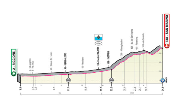 Sono 34,7 i chilometri da affrontare. La prova contro il tempo sammarinese si presenta impegnativa sì per la lunghezza, ma soprattutto per il tracciato. I primi 22 km sono in continua e leggera ascesa; arrivati nella Repubblica di San Marino si inizierà a salire precipitosamente, con pendenze che si inaspriscono per ben 12 km fino al traguardo. Il momento più ostico da affrontare si trova nella prima parte dell’ascesa, con punte che si aggirano intorno al 10%,e una media del 6,5% fino a Fiorentino. Da qui, tra falsopiani e contro-pendenze, la salita inizierà ad addolcirsi e stabilizzarsi intorno al 6% per gli ultimi 2 km della prova, preceduti da una breve discesa. Rettilineo conclusivo di 300 metri in asfalto, con la linea d’arrivo posizionata in un punto dove le pendenze si attenuano leggermente.