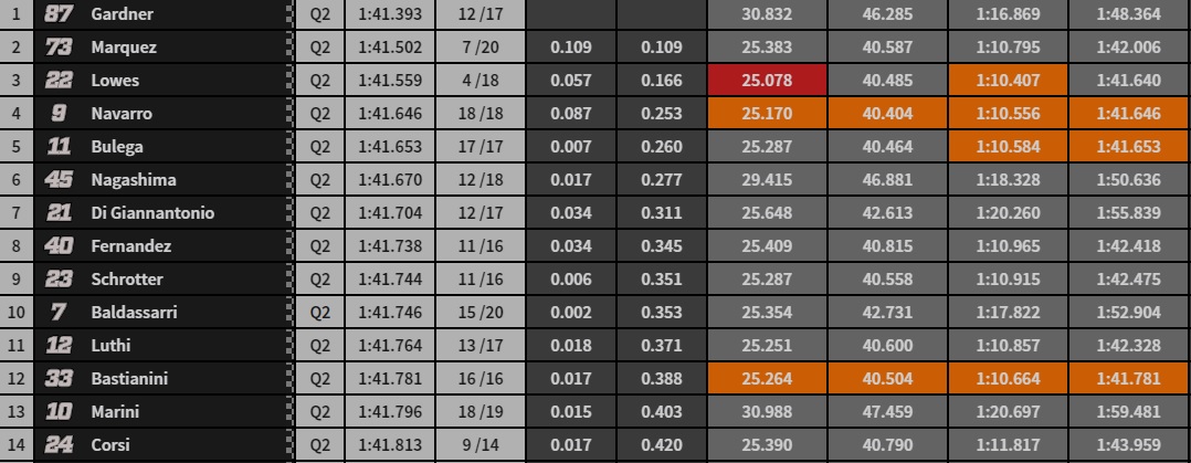 11.41: Di seguito quindi i qualificati alla Q2: il migliore è l’australiano Gardner con il crono di 1’41″392 (record della pista) a precedere Marquez (1’41″502) e Lowes (1’41″559). Eccellente Bulega 5°, tornato per questo round dopo aver saltato l’appuntamento di Austin per problematiche fisiche. Bene anche Di Giannantonio 7°. Rientrano nella top-14 anche Baldassarri 10°, Bastianini 12°, Marini 13° e Corsi 14°. Le KTM ufficiali di Binder e Martin in Q1