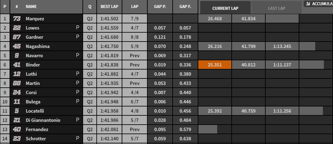 11.38: Bulega migliora il suo crono e, sfruttando il riferimento di Gardner davanti, si porta in 14esima piazza rientrano nel novero dei piloti qualificati alla Q2. Marini anche migliora il suo tempo ed è 11° nel combinato.