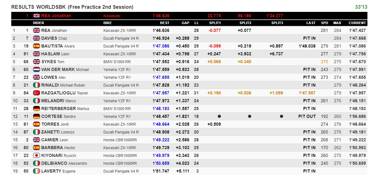 11.33 La sessione ha dato delle risposte interessanti, Bautista è effettivamente in difficoltà mentre Rea è pronto e cattivissimo, e punterà alla prima tanto agognata vittoria stagionale domani.