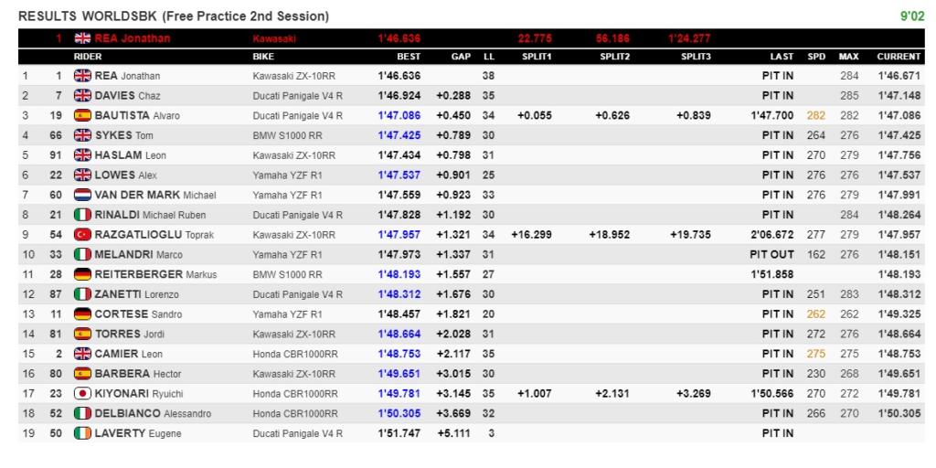 14.41: Tom Sykes ha portato la sua BMW in quinta posizione, davanti alla Yamaha di Michael van der Mark. I due sono separati da 7 millesimi e restano a 9 decimi dalla vetta. Michael Ruben Rinaldi è stato autore di un ottimo avvio di weekend, con la settima posizione in sella alla Ducati Panigale V4 R del team Barni. L’italiano è il primo pilota ad andare oltre il secondo di ritardo.