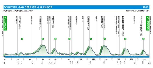 Dopo circa 25 chilometri pianeggianti il primo strappo di giornata, Meaga, un semplice antipasto per quello che aspetterà i corridori (3,9 km al 3,5%). Poco dopo anche Iturburu ed Alkiza: altre due asperità brevi e non troppo dure, rispettivamente 3,5 km al 5% e 4,0 km al 6,5%. Superata metà gara (tratto intermedio piuttosto tranquillo) si inizia ad andare verso il tratto più importante e decisivo della corsa. La salita più nota è ovviamente lo Jaizkibel (7,8 km al 5,8 %): discesa e subito dopo si va verso l’Alto de Erlaitz, davvero molto dura, con pendenza massima che arriva al 15% ed un tratto di 4 km intorno all’11% di pendenza media. Non è finita qui: ancora 70 chilometri al traguardo. Tra le novità, a circa 40 dall’arrivo, Mendizorrotz, non durissima come le precedenti. Scollinamento e si andrà verso la salita conclusiva: Murgil Tontorra. 1,8 km con pendenza media del 10,5 % e brevi tratti che sfiorano addirittura il 20%. Si arriva in vetta a 7 chilometri dal traguardo, da lì in poi breve discesa e pianura verso il traguardo.
