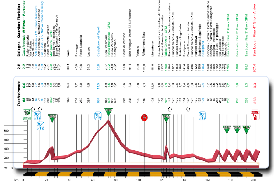Come detto in precedenza il raduno di partenza avverrà dal Quartiere Fieristico di Bologna, mentre la partenza ufficiale avverrà a Casalecchio di Reno. Il primo traguardo volante sarà già al chilometro 9, a Zola Predosa, mentre il secondo al chilometro 12,9 in località Gessi. Da qui si inizierà a scalare il primo GPM di giornata, Mongardino, che vede la sua vetta al chilometro 22. Successivamente si scenderà fino a Vado, e da qui si ricomincerà a salire pian piano per 38 chilometri fino al GPM del Passo Brasimone, preceduto ad 8 chilometri dalla sua vetta dal traguardo volante di Castiglione dei Pepoli. Il percorso proseguirà tutto in discesa fino al brevissimo e ripido GPM del Valico Ganzole, posizionato al chilometro 126. Prima di tornare a Bologna il tragitto sarà completamente piatto con il traguardo volante di Rastignano al chilometro 158. Arrivati nel capoluogo emiliano, al chilometro 170 ci sarà il primo passaggio sul San Luca. Ogni giro dei quattro in programma misura circa 9 chilometri. La parte più incisiva della scalata è all’altezza dell’arco che segnala gli ultimi 1000 metri prima del traguardo.