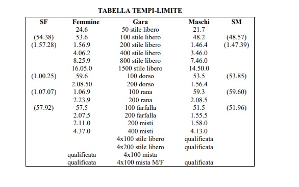 2) che avranno conseguito, in occasione delle finali A individuali del Campionato Italiano Assoluto di marzo, tempi migliori o uguali a quelli previsti, fino al numero massimo di quattro atleti nelle gare dei 100 e 200 stile libero e di un atleta nelle gare dei 100 metri dorso, rana e farfalla, fermo restando il predetto limite di quattro Atleti al quale concorrono quelli già qualificati in base al criterio di cui al precedente comma 1).