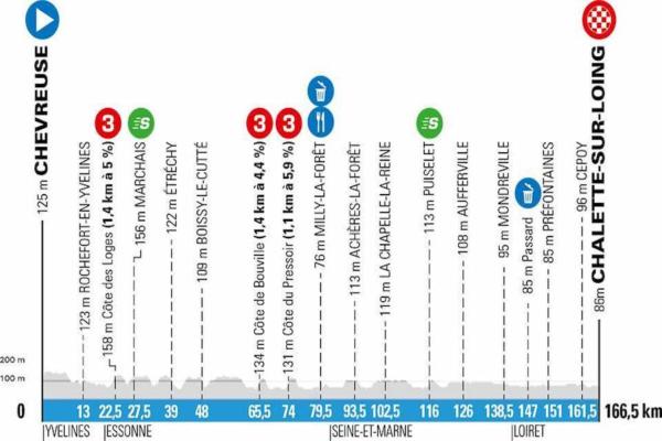 Tappa piatta con un finale che presuppone una volata più che scontata. Sono presenti solamente tre gran premi della montagna di terza categoria, brevi e tutti nella prima parte della frazione. Uno al chilometro 22,5, la Côte des Loges, misura 1,4 km al 5% di pendenza, ed è subito seguito dal traguardo volante di Marchais. La seconda ascesa, la Côte de Bouville, al chilometro 65, è di 1,4 km al 4,4%. L’ultimo GPM arriverà poco dopo, al chilometro 74: Côte du Pressoir, 1,1 km al 5,9%. Da qui in poi un lungo rettilineo sino all’arrivo. È presente però il traguardo volante di Puisset al chilometro 116, un’altra ghiotta occasione per accaparrarsi qualche punto prezioso. Il finale è completamente piatto sino al traguardo di Chalette-sur-Loing.