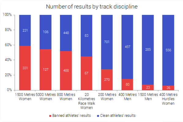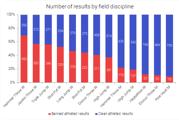 Al contrario, ci sono sette discipline in cui il numero di risultati cancellati per doping supera quello dei risultati puliti! Le “ripugnanti sette” sono tutte nel settore femminile, ovverosia 800, 1.500 e 5.000 metri, nonché lancio del martello, tiro del giavellotto, getto del peso e salto triplo.