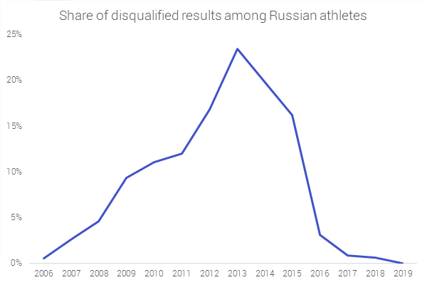 Interessante notare come la schiacciante maggioranza dei risultati poi cancellati per doping siano stati riscontrati proprio in competizioni disputate in Russia (43,2%), segno di come le pratiche proibite siano utilizzate soprattutto per emergere a livello interno. Invece, i Paesi esteri in cui i russi sono stati trovati nelle mani nella marmellata con più frequenza sono Germania (6,3%), Gran Bretagna (5,5%) e Italia (5,3%), non a caso nazioni dove la lotta al doping viene effettuata con più rigore.