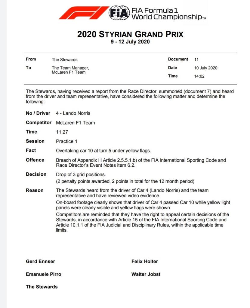Non arrivano grandi notizie per il britannico della McLaren Lando Norris, impegnato come tutti i piloti nelle prove libere del GP di Stiria 2020 (secondo round del Mondiale di F1). Ebbene, l’alfiere della scuderia di Woking (andato a podio nella prima apparizione sul Red Bull Ring) sarà penalizzato di tre posizioni in griglia di partenza per non aver rispettato le bandiere gialle nelle PL1: la manovra incriminata è quella di aver superato l’AlphaTauri di Pierre Gasly.