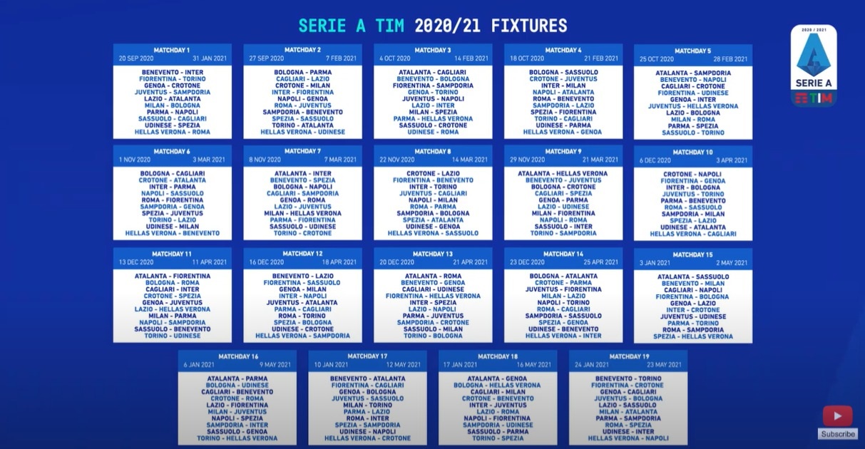 - le squadre che partecipano Champions League (Atalanta, Inter, Juventus e Lazio) non possono incontrare le squadre che partecipano all’Europa League (Napoli, Milan e Roma) nelle giornate che si disputano tra un turno di Europa League e un successivo di Champions.