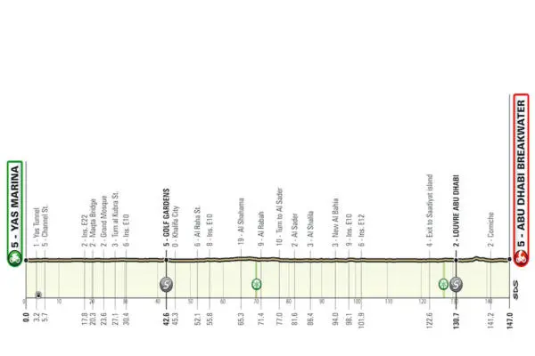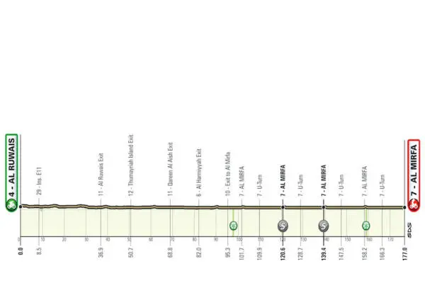 La prima tappa, Al Ruwais-Al Mirfa (177 km), attraverserà la regione di Abu Dhabi prima di raggiungere la città costiera di Al Mirfa, dov’è previsto un emozionante finale di volata di gruppo. Il giorno successivo, in occasione della seconda tappa, la Hudayriat Island-Hudayriat Island (13 km), i corridori si sfideranno in una breve e veloce cronometro individuale. Anche se breve, questa prova contro il tempo fornirà, senza ombra di dubbio, un’opportunità per guadagnare tempo in una classifica generale molto combattuta.