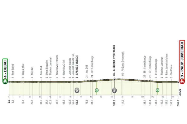 La sesta tappa, ossia la Dubai-Palm Jumeirah (166 km), vedrà i corridori sfidarsi su di un percorso prevalentemente pianeggiante dalle isole Deira, Dubai, fino all’iconica Palm Jumeirah. A circa 60 km dalla partenza, il gruppo si ricongiungerà alla pista ciclabile di Al-Qudra, una pista asfaltata incontaminata lunga 86 km, che attraversa il deserto di Dubai, prima di tornare in città per la volata conclusiva. La settima e ultima tappa, Yas Marina-Abu Dhabi Breakwater (147 km), partirà dallo Yas Mall e seguirà un percorso pianeggiante che porta nel cuore della capitale degli Emirati Arabi Uniti, Abu Dhabi, prima di un più che scontato sprint finale lungo il frangiflutti della città, dove verrà decretato il vincitore della terza edizione dell’UAE Tour.