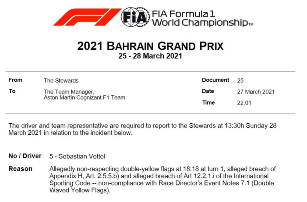 Bandiere gialle che potrebbe costare ulteriormente al tedesco. Vettel, infatti, è stato convocato dai commissari in data odierna (ore 13.30 locali) per non aver rallentato in maniera significativa in regime di doppia bandiera gialla causato dal testacoda del russo Nikita Mazepin in curva-1. Da verificare, dunque, la posizione dell’ex pilota ferrarista.