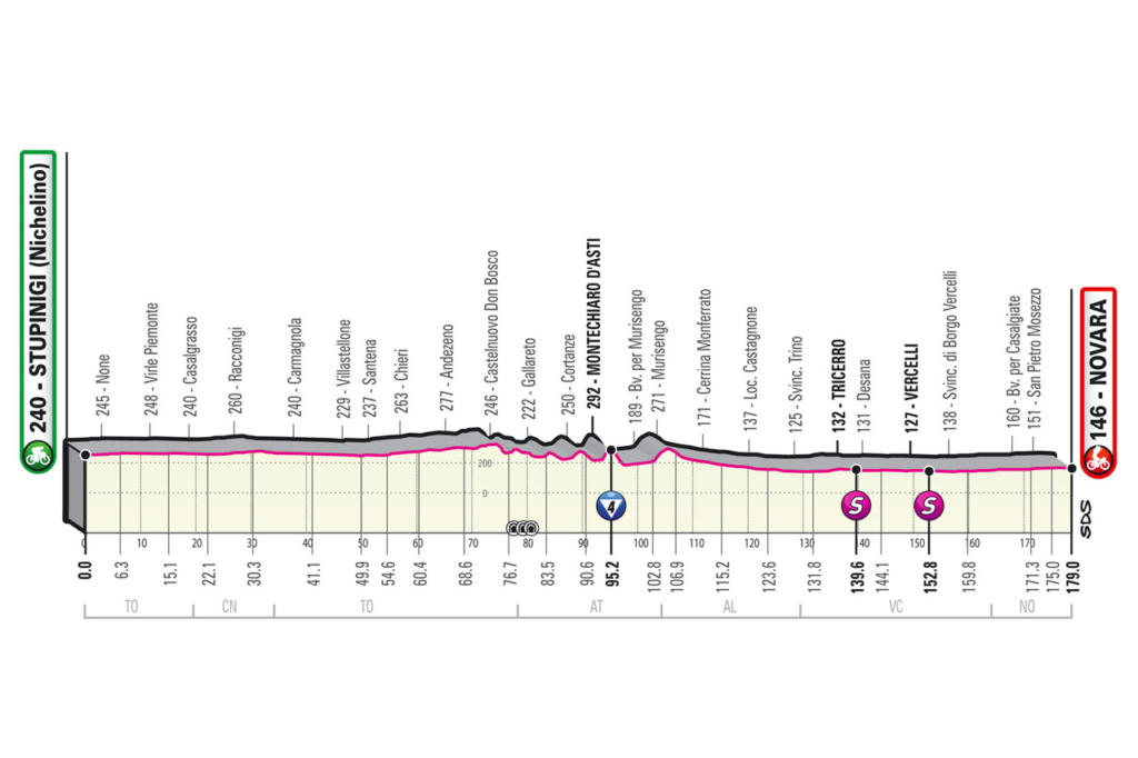 Frazione completamente pianeggiante con alcune ondulazioni nella parte centrale che non dovrebbero creare alcun problema al gruppo. Si partirà dell’hinterland torinese fino a raggiungere l’Astigiano dove i ciclisti affronteranno l’unico GPM della giornata, una salita di quarta categoria a Montechiaro d’Asti.