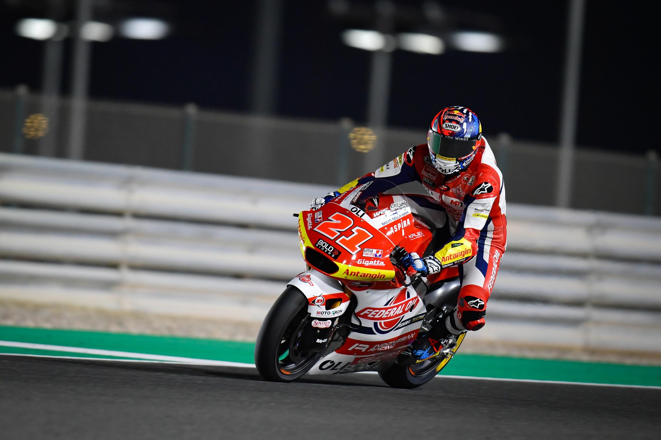 Ottimo avvio di weekend a Losail per i colori azzurri in Moto2, con due nostri portacolori davanti a tutti al termine della prima sessione di prove libere del Gran Premio di Doha 2021, secondo round stagionale del Motomondiale. Fabio Di Giannantonio, reduce dal bellissimo podio di gara-1, si conferma in grande spolvero in Qatar sulla sua Kalex del Team Federal Oil Gresini e firma il miglior tempo assoluto in 1’59″931, mettendo in evidenza un ritmo molto interessante.