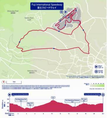 Il percorso della cronometro olimpica prevederà due tornate del circuito che parte ed arriva al Fuji International Speedway, già protagonista del traguardo in questi giorni. Ogni giro sarà composto da 22,1 chilometri, per 44,2 totali (al maschile, tornata singola per le donne): 423 metri di dislivello per tornata, con i diversi saliscendi che abbiamo visto attorno all’Autodromo che renderanno dura la gara. Di pianura, di fatto, quasi non ce n’è.