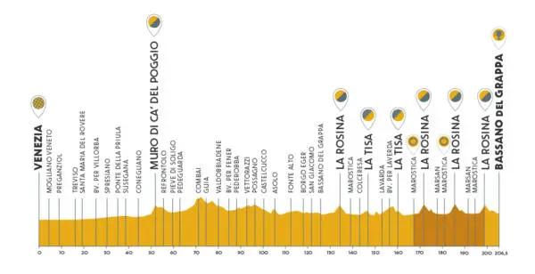 La nuova classica, con un tracciato di 208 km, porterà i corridori da Venezia a Bassano del Grappa. Come si evince dall’altimetria di seguito, la parte iniziale è quella meno ricca di insidie: percorso pianeggiante sino al km 50, in cui i partecipanti dovranno affrontare il Muro di Ca’ del Poggio, il primo ostacolo: 140 m di dislivello, pendenza media del 12.7%, massima pari al 19%.