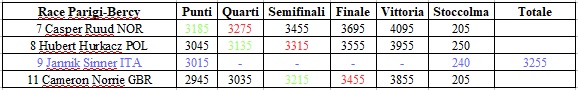 Jannik Sinner è a quota 3015 e vincendo a Stoccolma arriverebbe a quota 3255 nella Race. Dunque Sinner sarebbe definitivamente eliminato dalla corsa alle Finals prima del torneo ATP 250 della prossima settimana se si verificassero a Parigi-Bercy contemporaneamente almeno due dei tre seguenti casi: