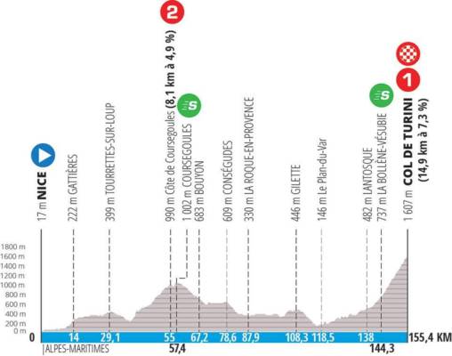Tappa abbastanza breve ma che ha le sue belle insidie. Il primo GPM di giornata è la Cote de Coursegoules, seconda categoria di 8 chilometri al 4,9%, seguito dal primo traguardo di giornata a Coursegoules al chilometro 57,4. Parecchi chilometri mossi fino a Le Plan-du-Var, dove si riprende a salire leggermente, ma l’ascesa vera comincerà a Lantosque, con gli ultimi 14,9 chilometri verso il Col de Turini: pendenza media del 7,3%, ma con picchi massimi nella prima parte oltre il 10%.
