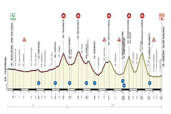 Si andrà da Pasturana fino a Genova per un totale di 191,7 km. Si comincerà con un tratto facile, poi inizieranno le insidie. Ci sarà al km 65.9 il GPM di Fraconalto (5,5 km al 6.8%), seguito al km 84.6 dal GPM di Crocetta d’Orero (5 km al 6,7%). Superate queste due prime asperità, i corridori dovranno percorrere un tratto in discesa prima di altri tre GPM: il Sant’Olcese al km 123.7 (5,2 km al 5,5%), il Pietralavezzara al km 149,6 (6,2 km al 7,7%) e, infine, il GPM di Madonna della Guardia al km 166,5 (6,9 km al 7,8%). Seguirà una lunga discesa e un ultimo tratto in pianura che porterà all’arrivo.