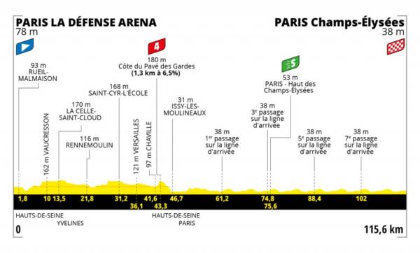 Tappa quasi interamente piatta adatta ai velocisti. L’unica difficoltà di giornata sarà la Côte du Pavé des Gardes, salita di quarta categoria (1,3 km al 6,5% di pendenza media) posta dopo 43,3 km. Seguirà un circuito da percorrere per ben sette volte fino all’arrivo storico sugli Champs-Élysées.