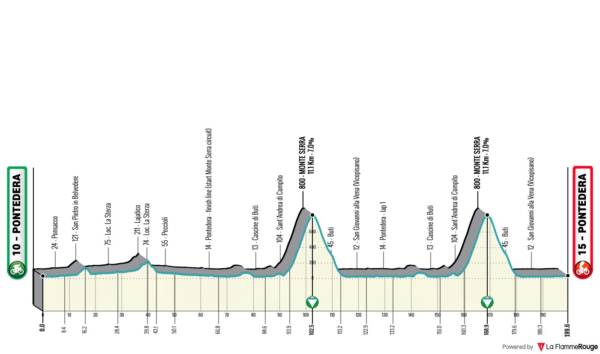 Il Monte Serra verrà affrontato dal versante opposto rispetto a quello dello scorso anno. La salita di 11.n1 km al 7% di pendenza media sarà ugualmente dura ma più lunga rispetto alle passate edizioni. Lo scollinamento è posto a 31 km dal traguardo, di cui 11 sono in discesa.