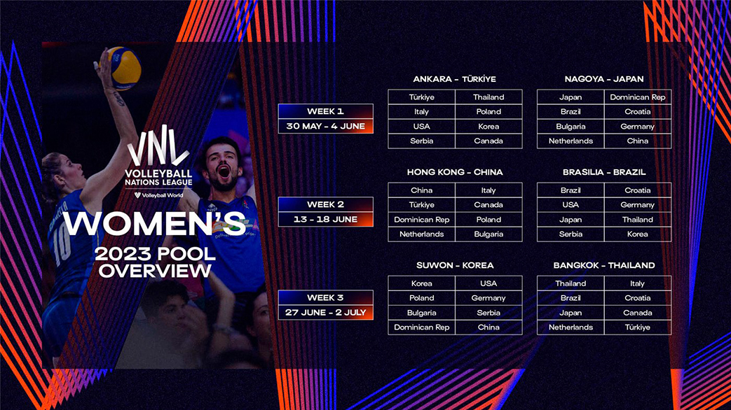La FIVB ha comunicato le date e le località in cui si disputerà la Nations League 2023 di volley, il torneo per Nazionali che va in scena nella prima parte dell’estate. All’evento parteciperanno le migliori 16 squadre al mondo, che saranno impegnate in tre gironi di qualificazione. Al termine le migliori cinque formazioni si qualificheranno alla Final Six insieme al Paese che ospiterà gli atti conclusivi della kermesse. La Final Six maschile si disputerà dal 19 al 23 luglio, mentre le donne saranno impegnate dal 12 al 16 luglio. Le sedi verranno comunicate a dicembre.