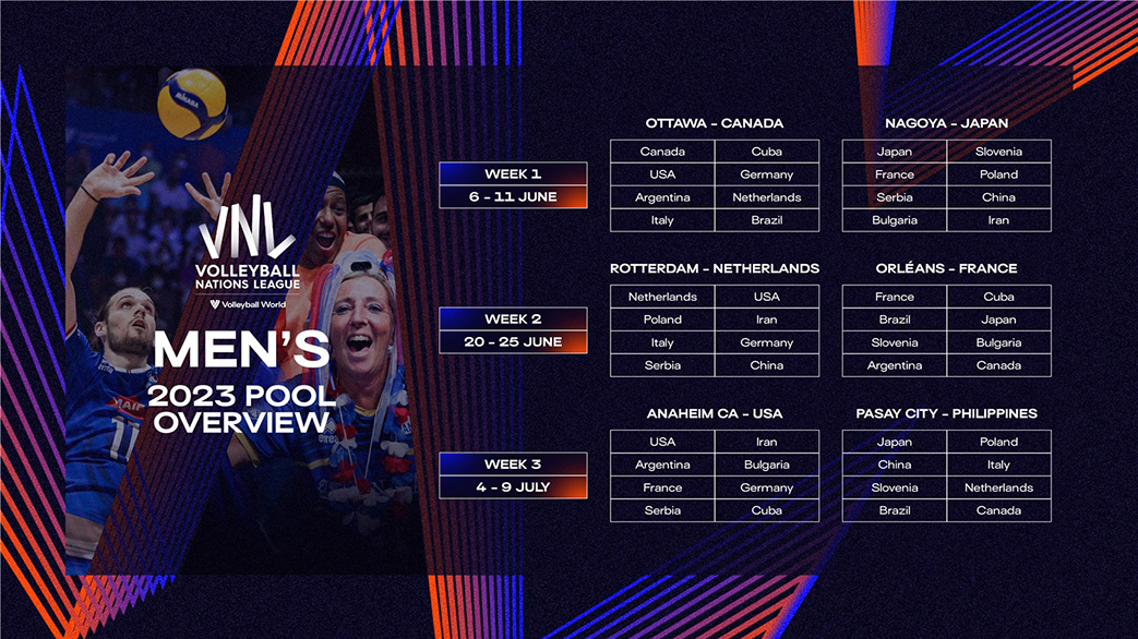 Gli azzurri giocheranno a Ottawa (Canada), Rotterdam (Paesi Bassi) e Pasay City (Filippine), mentre le azzurre scenderanno in campo ad Ankara (Turchia), Hong Kong (Cina) e Bangkok (Thailandia). Le donne inizieranno tra il 30 maggio e il 4 giugno, gli uomini debutteranno tra il 6 e l’11 giugno. Seconda settimana femminile prevista tra il 13 e il 18 giugno, quella maschile scatterà due giorni dopo. Grande chiusura per il settore femminile dal 27 giugno al 2 luglio, mentre per il settore maschile tra il 4 e il 9 luglio: a quel punto sapremo le ammesse alla Nations League.