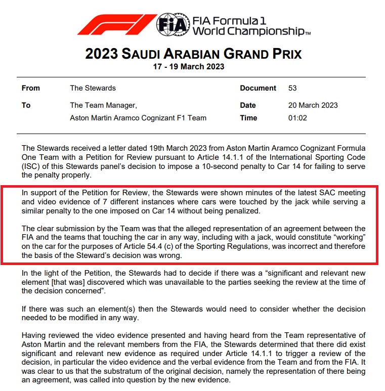 Come è stato possibile? La scuderia britannica ha dimostrato che non ci fosse un chiaro accordo tra squadre e FIA sul fatto che toccare la vettura con il cric fosse considerato un effettivo intervento su di essa. Come si legge dal documento poi pubblicato dalla Federazione: “A sostegno della petizione di revisione, ai commissari sportivi sono stati mostrati i verbali dell’ultima riunione della SAC e le prove video di 7 diversi casi in cui le vetture sono state toccate dal cric, mentre scontavano una penalità simile a quella inflitta alla vettura 14 senza essere penalizzate. Il team ha dimostrato chiaramente che la presunta rappresentazione di un accordo tra la FIA e i team che prevedeva che toccare la vettura in qualsiasi modo, anche con un martinetto, costituisse un ‘lavoro’ sulla vettura ai fini dell’articolo 54.4 (c) del Regolamento Sportivo, era sbagliata e quindi la base della decisione del Commissario Sportivo era errata“.
