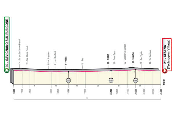 35 chilometri praticamente piatti, poche curve su strade ben pavimentate. Un paio di restringimenti nelle città di San Mauro Pascoli e Cesena, l’ultima curva arriva a 1900 metri dal traguardo. Tre i rilevamenti chilometrici, al chilometro 13, al chilometro 23,1 e al chilometro 29.