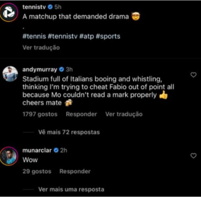 Per questo, sui canali social di Tennis Tv, nel post dedicato al match, Murray non le ha mandata a dire: “Uno stadio pieno di tifosi italiani che mi hanno fischiato perché pensavano volessi imbrogliare Fabio, per un punto. Solo perché non riuscivo a vedere correttamente un segno. Evviva“.