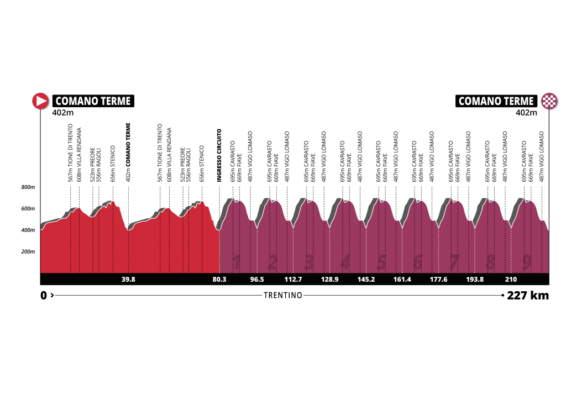 A quel punto inizia la discesa vera e propria, che non sarà particolarmente tecnica: sede stradale larga e appena tre tornanti. Una volta terminata la discesa, al nono giro il gruppo punterà direttamente verso il traguardo di Comano Terme. Il rettilineo finale, pianeggiante e ampio, misura circa 300 metri.