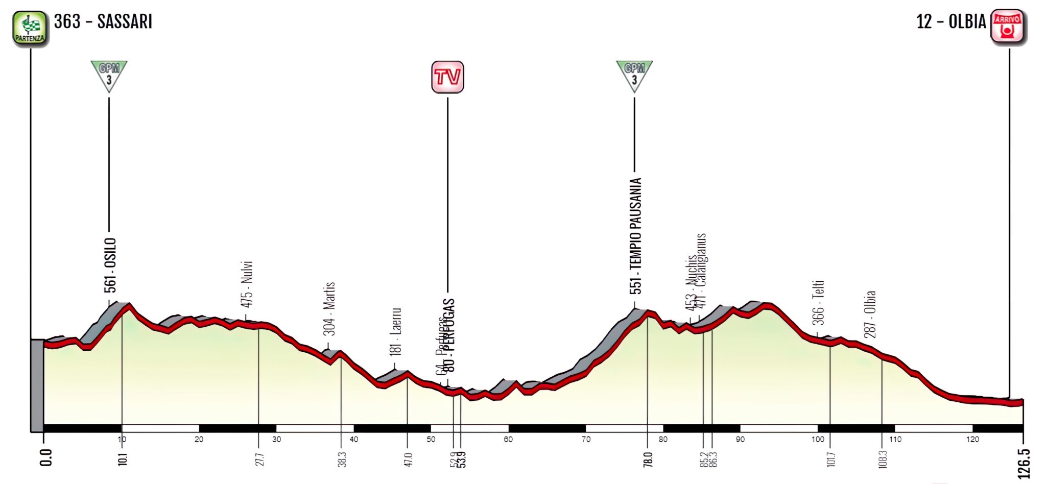 Si parte da Sassari per arrivare ad Olbia dopo 127 km. La seconda tappa più lunga di questa edizione presenta un percorso insidioso: si parte immediatamente con il GPM di 3a categoria di Osilo, 4,8 km al 5,2% che potranno fare da trampolino di lancio per azioni da lontano. Lungo altopiano e discesa a gradini per arrivare alla seconda salita, 7,7 km al 4,6% verso Tempio Pausania. Da lì al traguardo ci saranno da superare un paio di strappi ed un lunga discesa, prima degli ultimi 10 km pianeggianti.