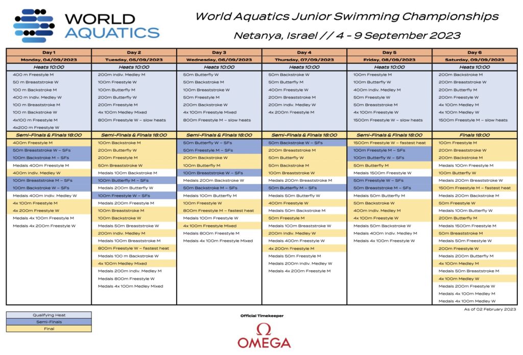 Dal 4 al 9 settembre Netanya (Israele) ospiterà l’edizione 2023 dei Mondiali 2023 juniores di nuoto. In programma sei giornate di gare presso il Wingate Institute con al via 645 nuotatori provenienti da 93 federazioni nazionali. L’Italia, reduce dai grandi successi degli Eurojunior di Belgrado (Serbia), vorrà replicare, mettendo in mostra tutte le proprie qualità.