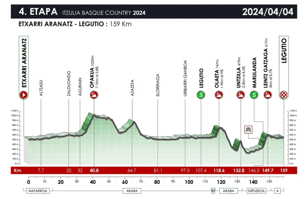 Frazione potenzialmente molto esplosiva, con una partenza più blanda e un finale che potrebbe riservare fuochi d’artificio. L’unica difficoltà nella prima parte sostanzialmente pianeggiante sarà la salita di Opakua (7,1 km al 5,8%). Vicine tra loro e concentrate negli ultimi 40 km le altre ascese: Olaeta (1,9 km al 9%), Untzilla (2,3 km all’8,5%), Leintz Gatzaga (3 km all’8,7%) dovrebbero infiammare gli uomini forti in salita. Dall’ultimo scollinamento mancheranno poco meno di 10 km, tutti in falsopiano tendente alla discesa.