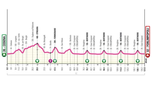Oltre 2000 metri di dislivello in una frazione breve ma scoppiettante (137 chilometri). Non c’è un attimo per respirare, soprattutto nella prima fase: si sale subito verso Cento e poi c’è lo strappo di Borghi (durissimo, 1,9 km al 9,8%) ad anticipare il GPM di Strigara. Si scende e si approccia un’altra ascesa breve ma dura, quella di Formigiano. Subito dopo ecco il circuito: cinque passaggi sulla linea d’arrivo ma soprattutto cinque scalate verso Bertinoro (2,7 chilometri al 6.1%).