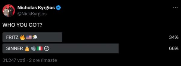 Di qui, le frecciate di Nick nei confronti dell’altoatesino sono state una costante. Alla vigilia della Finale, Kyrgios ha voluto “alzare l’asticella”. In primis, ha pubblicato un sondaggio su X, chiedendo ai suoi follower chi vincerà gli Us Open e accanto al nome di Sinner l’australiano ha aggiunto le emoticon della bandiera italiana, di un flacone e di un guanto (riferimento molto chiaro alla questione doping);