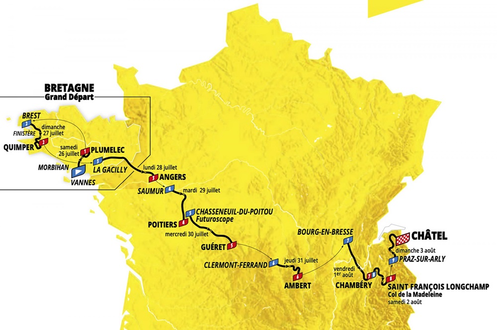 Si comincia dunque dalla Bretagna da Vannes con una prima frazione da 79 chilometri e che avrà subito un arrivo molto interessante in quel di Plumelec con uno strappo di quasi due chilometri al 6,7%.