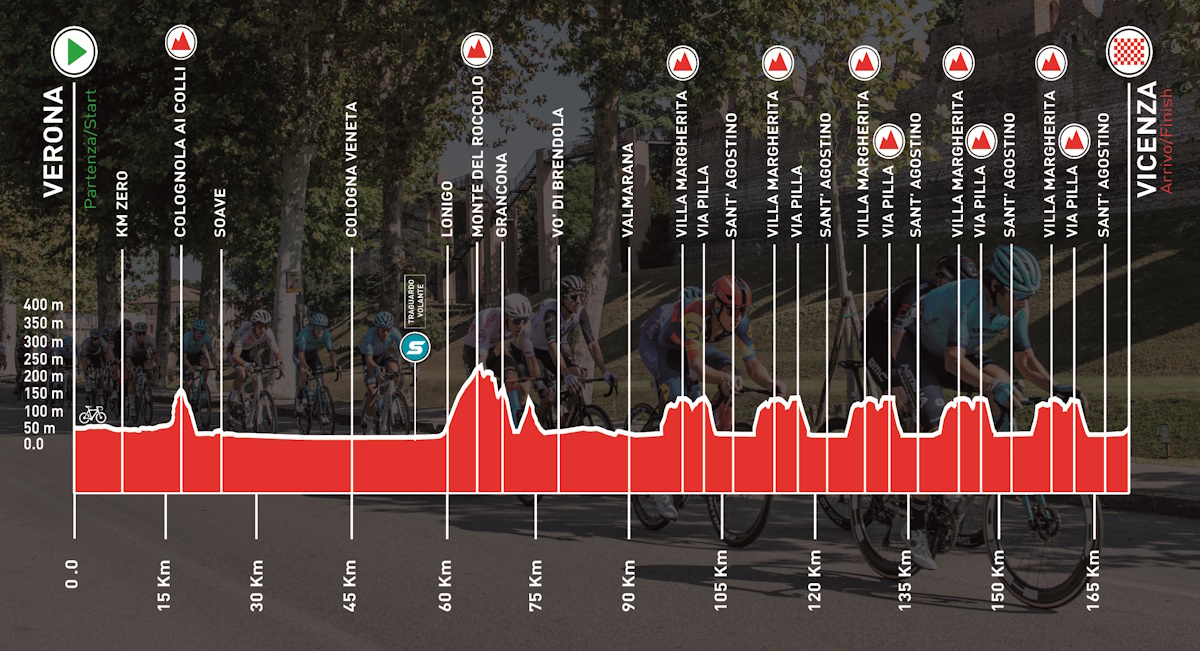 173 chilometri da percorrere. Colognola ai Colli (1.3 km al 7.7%) la prima salita di giornata, poi un tratto di pianura ad anticipare Monte del Roccolo (4.9 km al 3.9%). Attesa per il circuito finale, da ripetere cinque volte: presenti gli strappi di Monte Berico (1.1 km al 7.2%) e Torri di Arcugnano (1.1 km al 3.9%).
