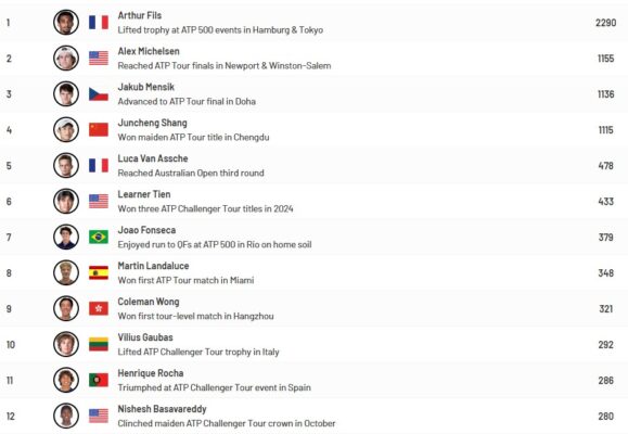Sono fuori dai giochi gli italiani: il primo in questa classifica è Gianluca Cadenasso, 37esimo con 82 punti, poi troviamo Federico Bondioli con 56 punti. Tanti di questi ragazzi sono ancora molto acerbi, su tutti Federico Cinà che sta mostrando le prime grandi cose a livello Challenger, ma è ancora 59esimo a 45 punti. Avendo appena 17 anni, il siciliano potrà riprovare a far parte di questa manifestazione nei prossimi anni, visto il suo indiscutibile talento.